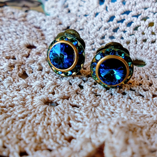 ブルーのラインストーンが見る角度でグリーンにも見えるちょっとミステリアスな雰囲気のイヤリング。 小さなサイズで可愛いです。 クリップタイプ。 コンディション:A 多少の使用感はございます。 サイズ:∅1.3cm