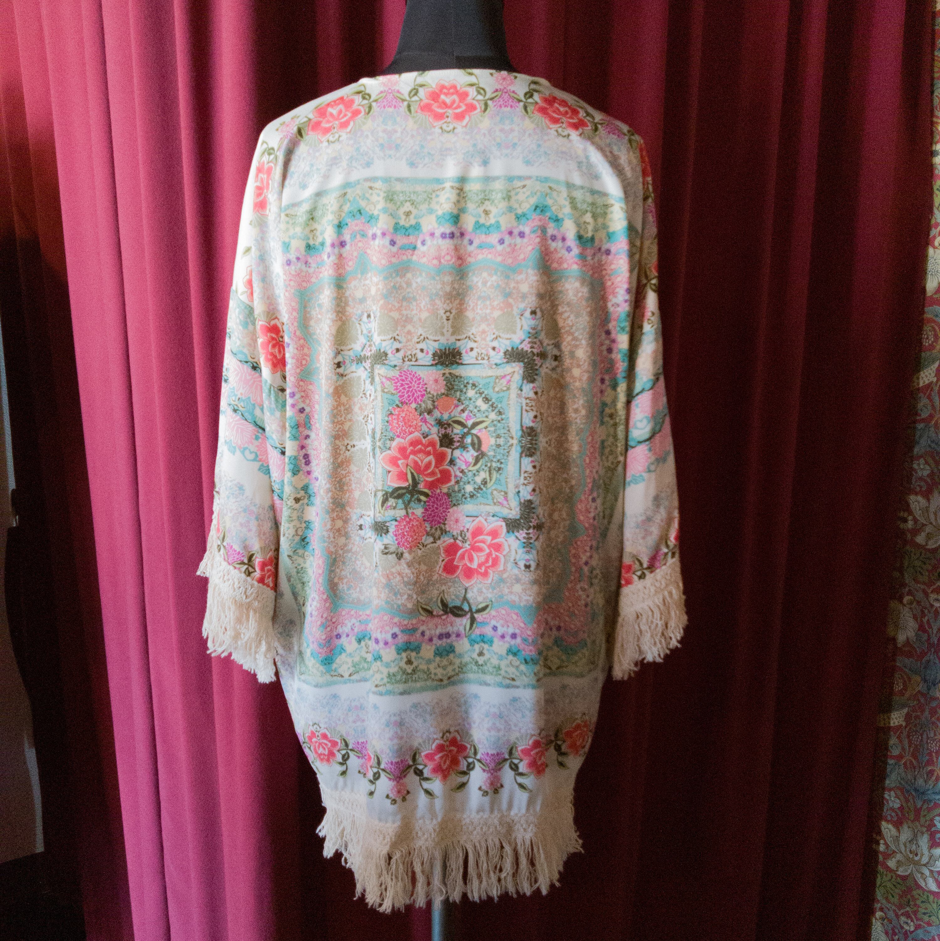 クロシェット&フリンジとプリントの相性がとてもかわいい着物スリーブのトッパーガウン。