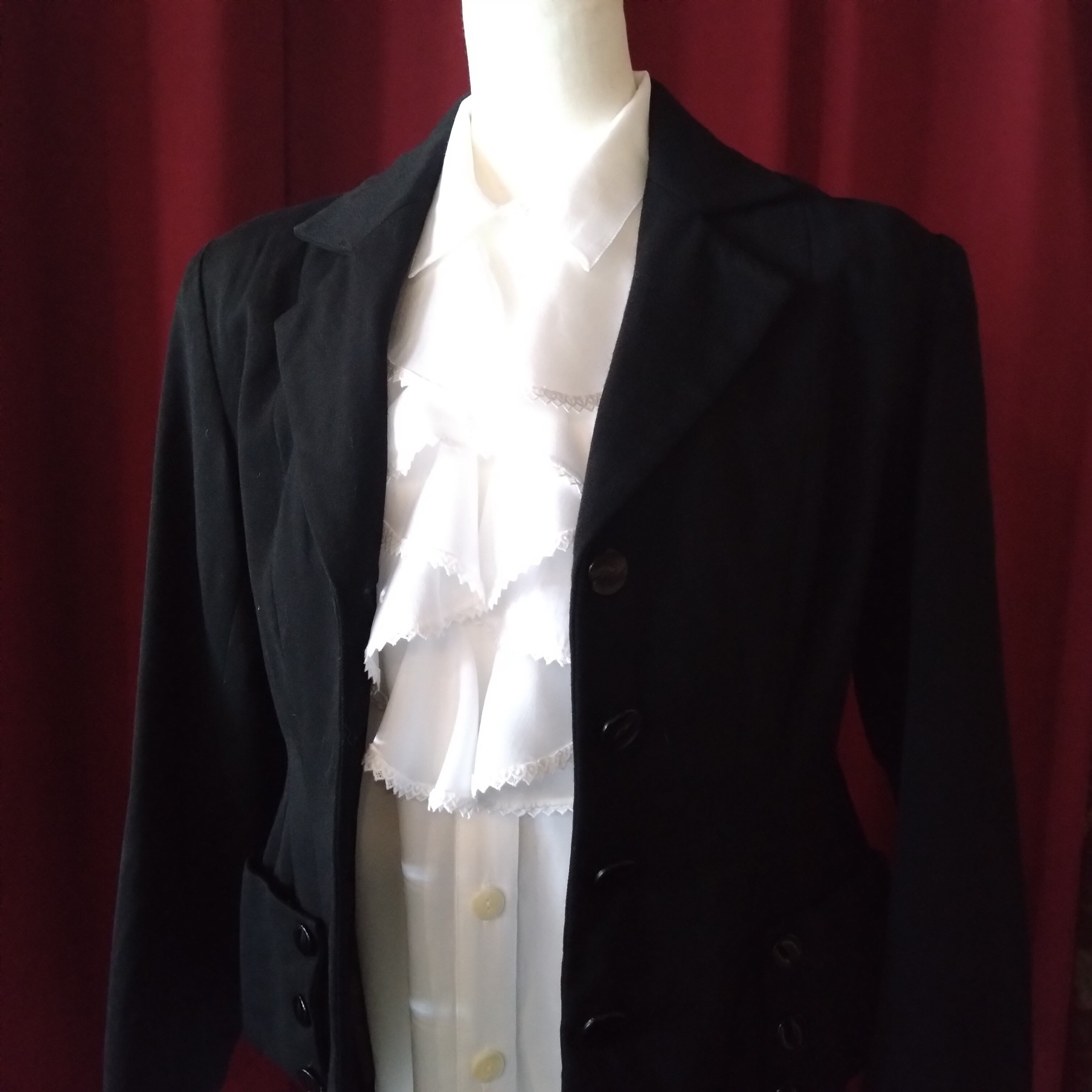 Vネックカーディガンやジャケットにインしてラッフルをアクセントに。