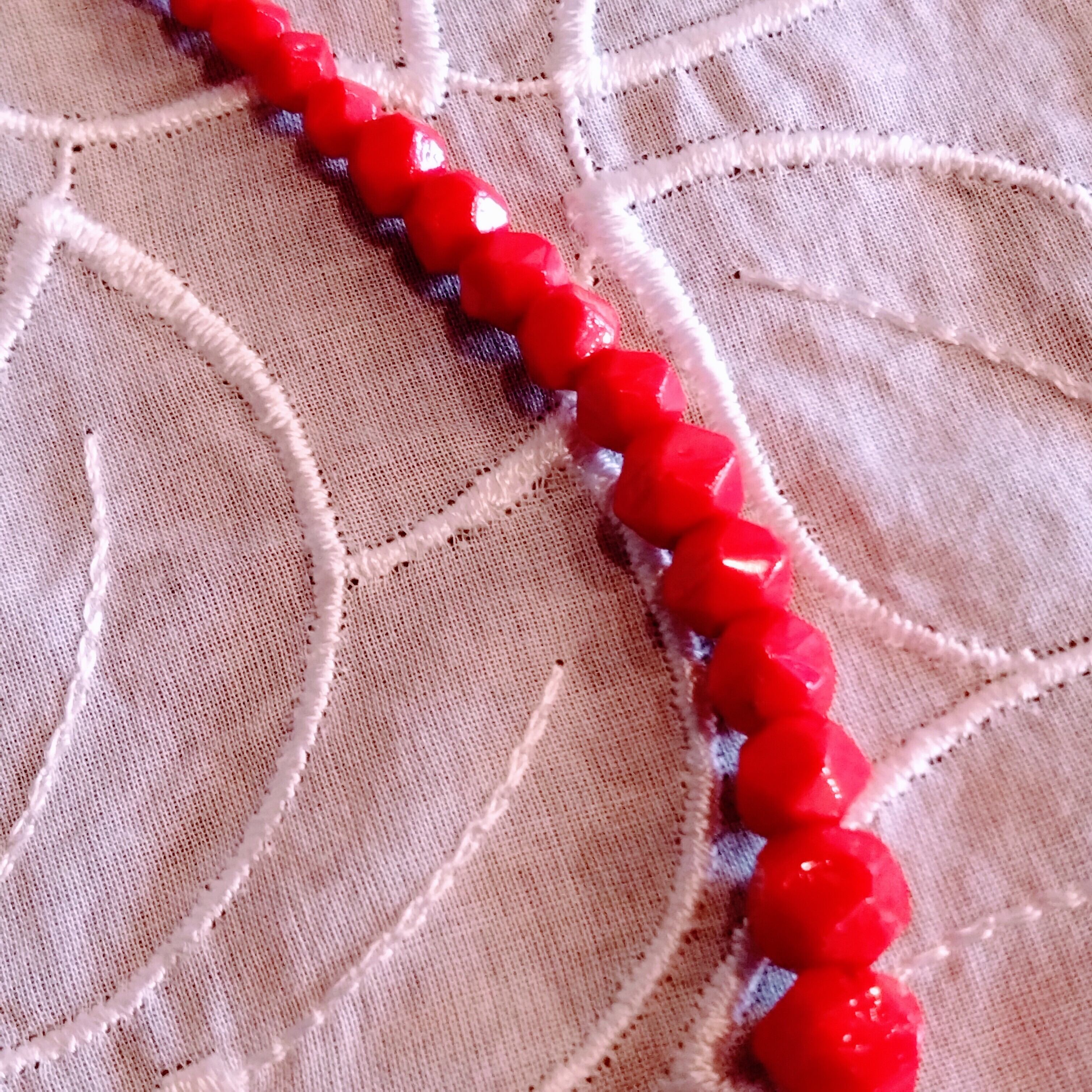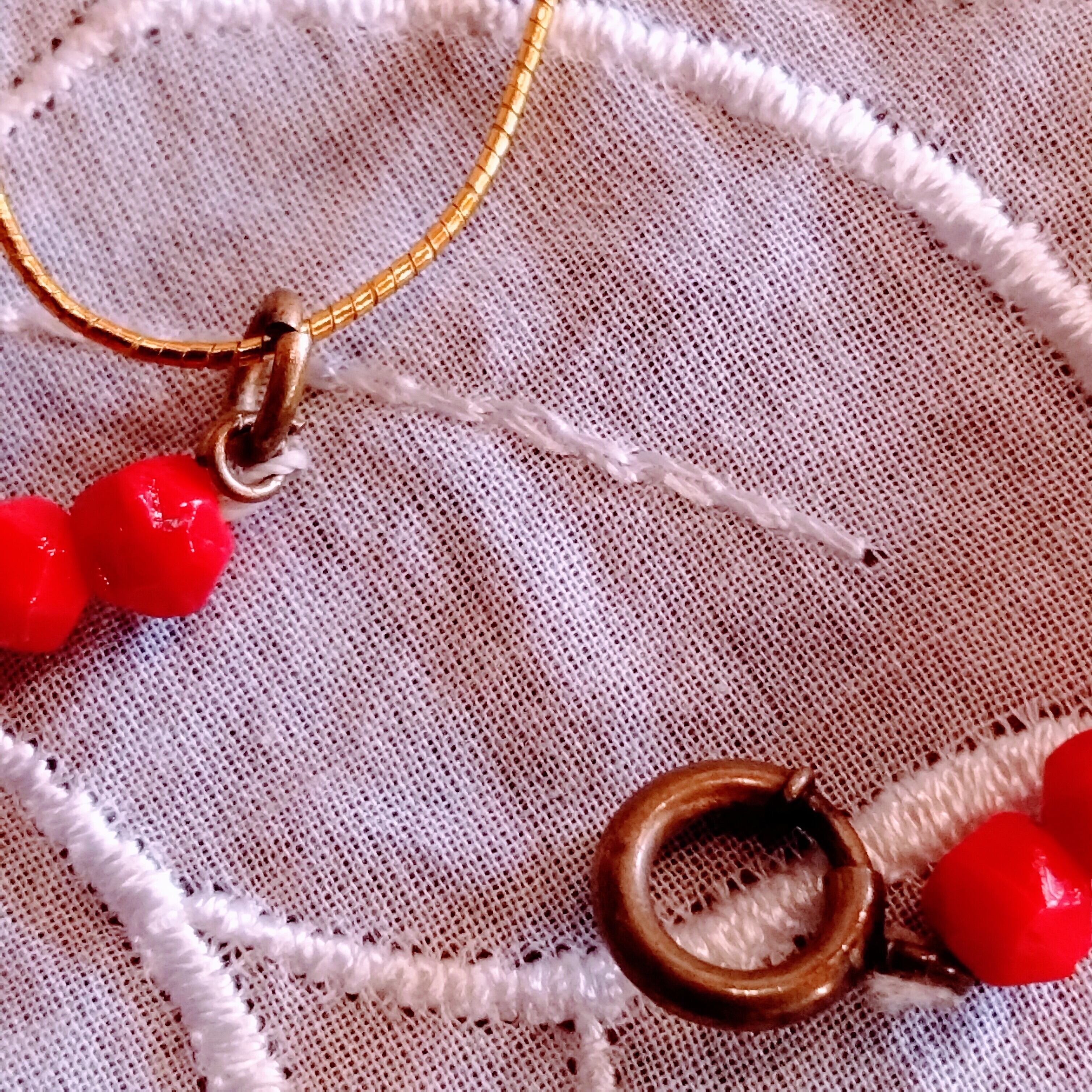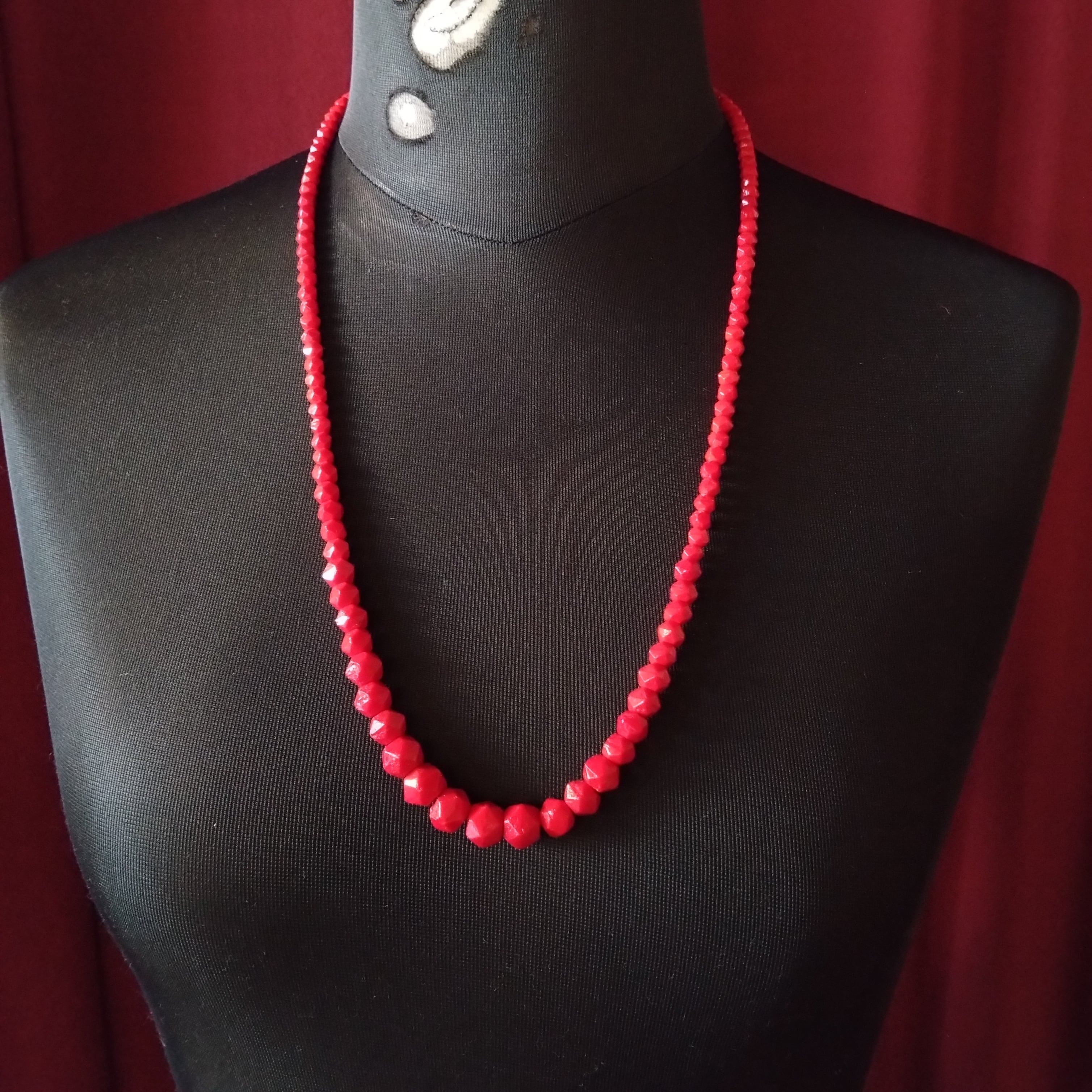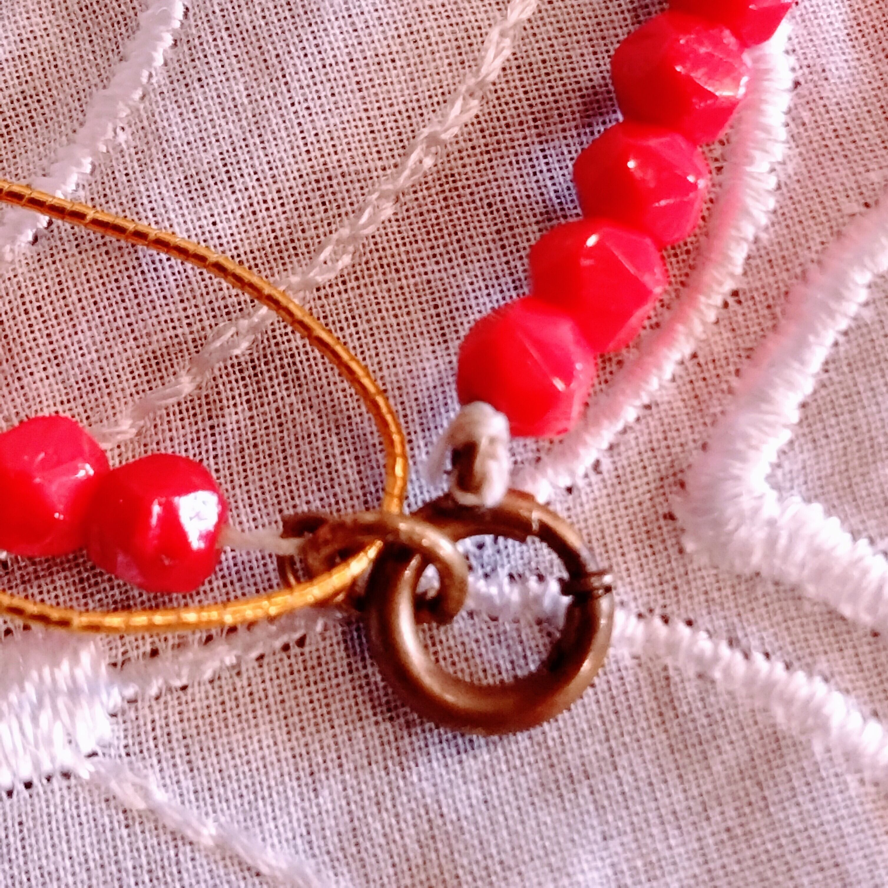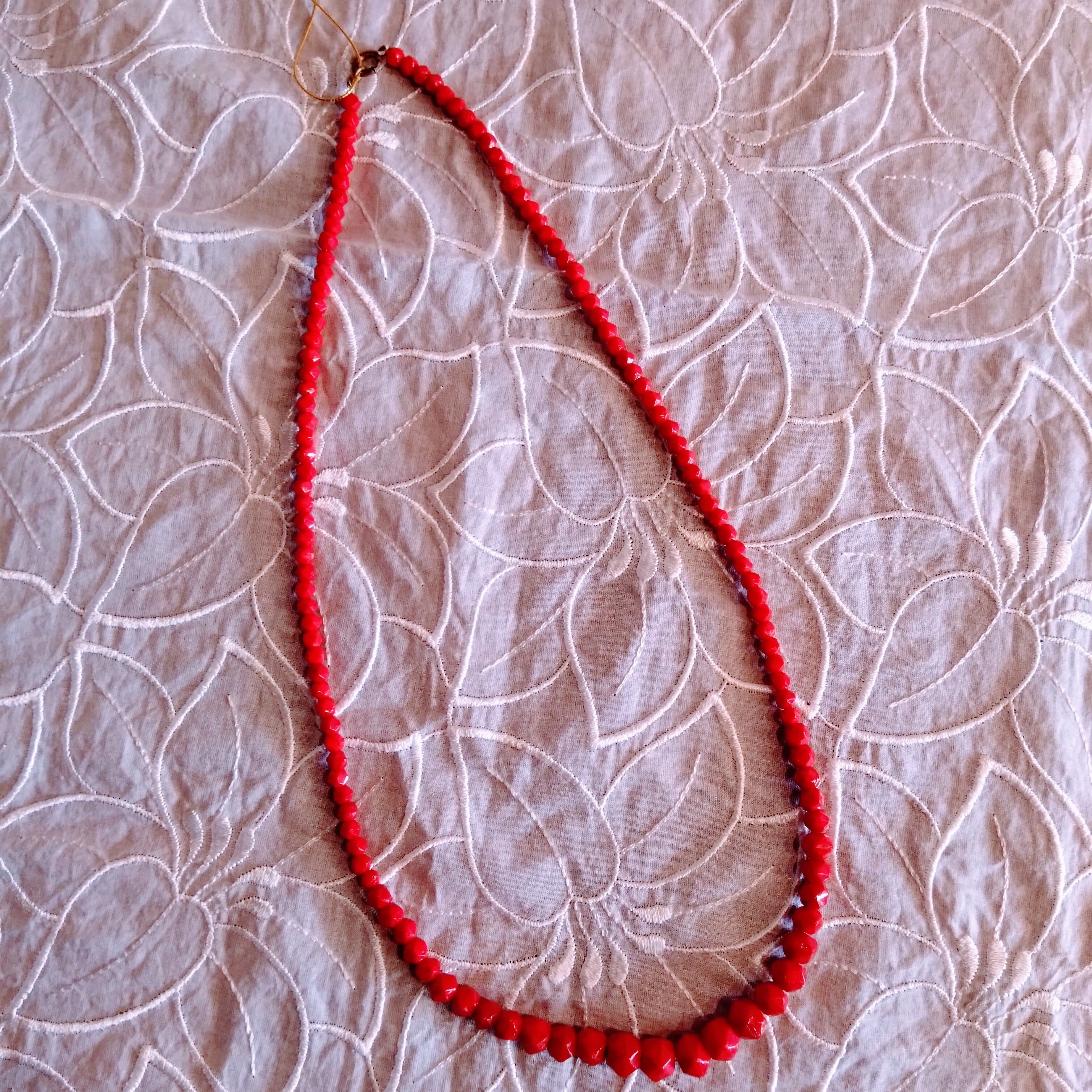 様々な大きさの鮮やかな赤ガラスビーズがきれいなネックレス。