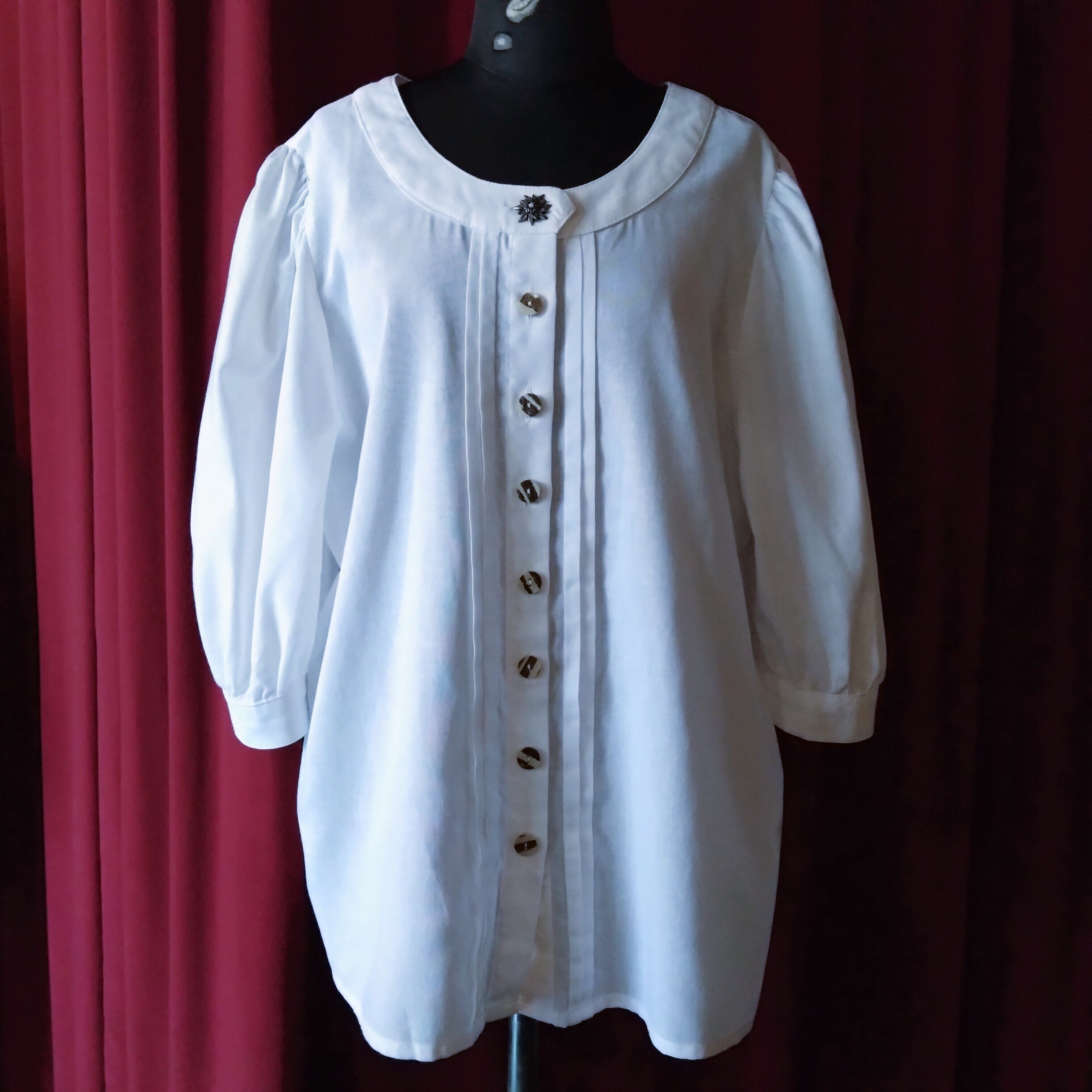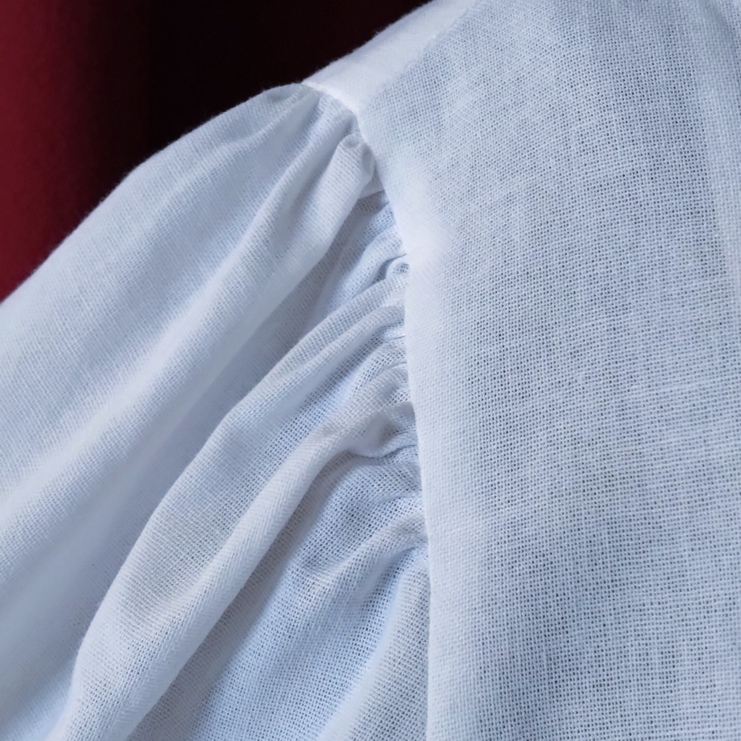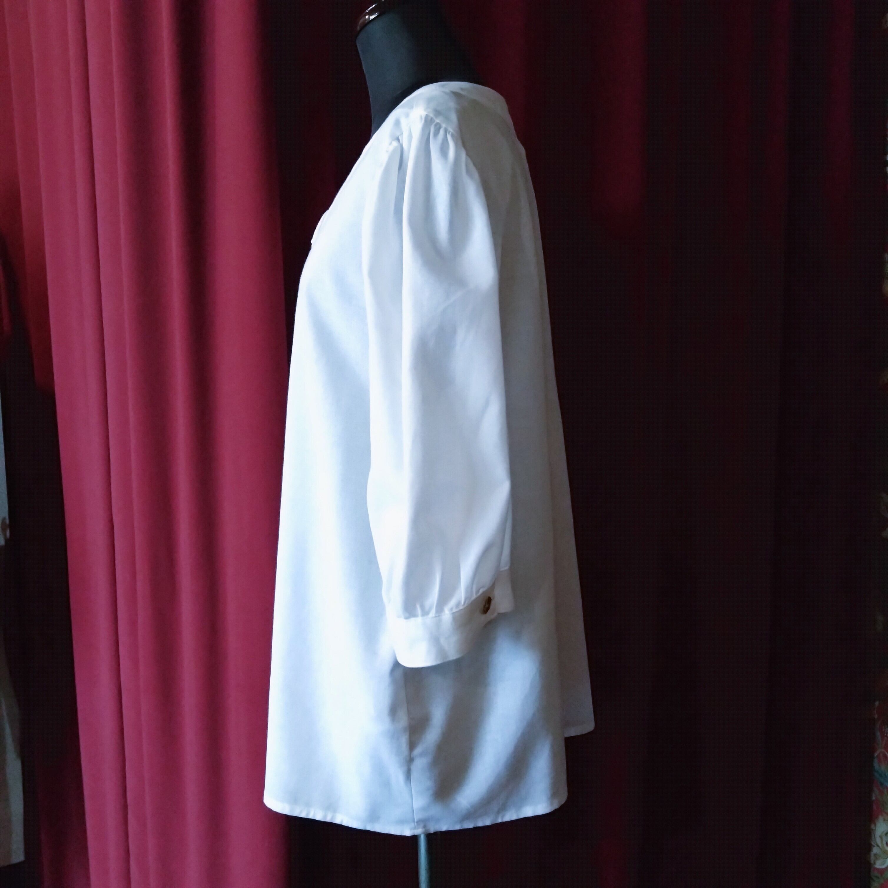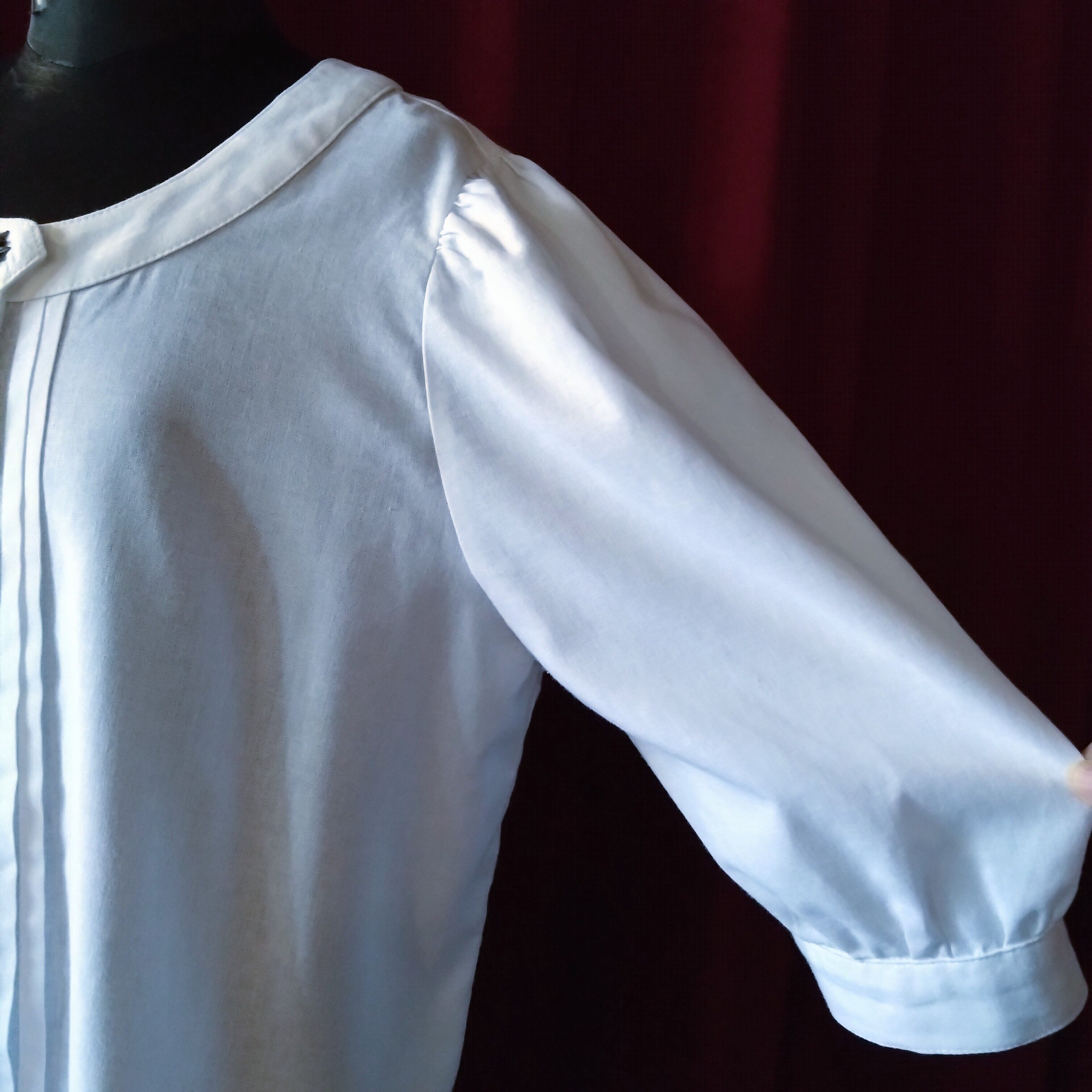 控えめなパフスリーブの七分袖、ラウンドネックですっきりと。