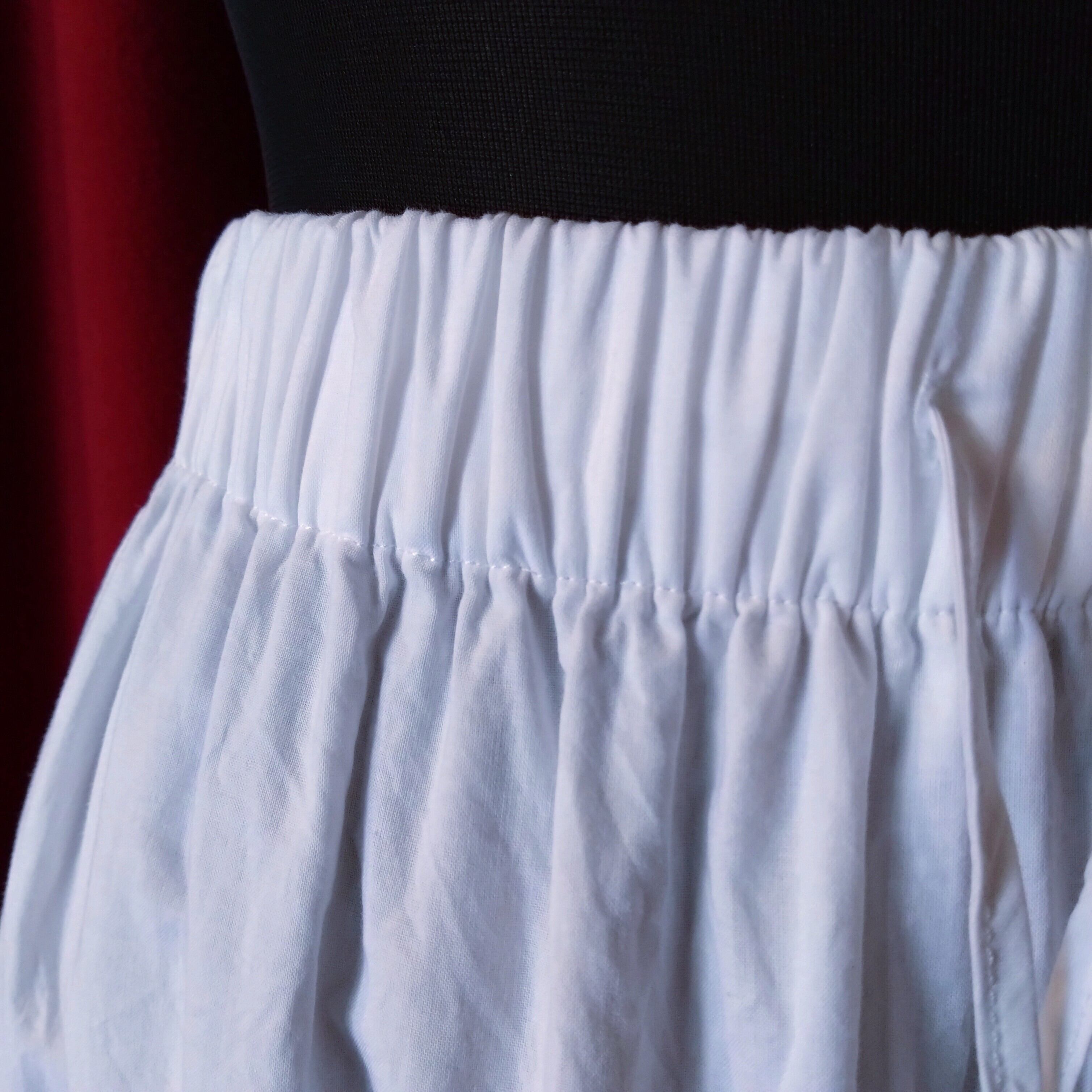 Wゴム、綿ローンの裏地付き、ポケット無し。