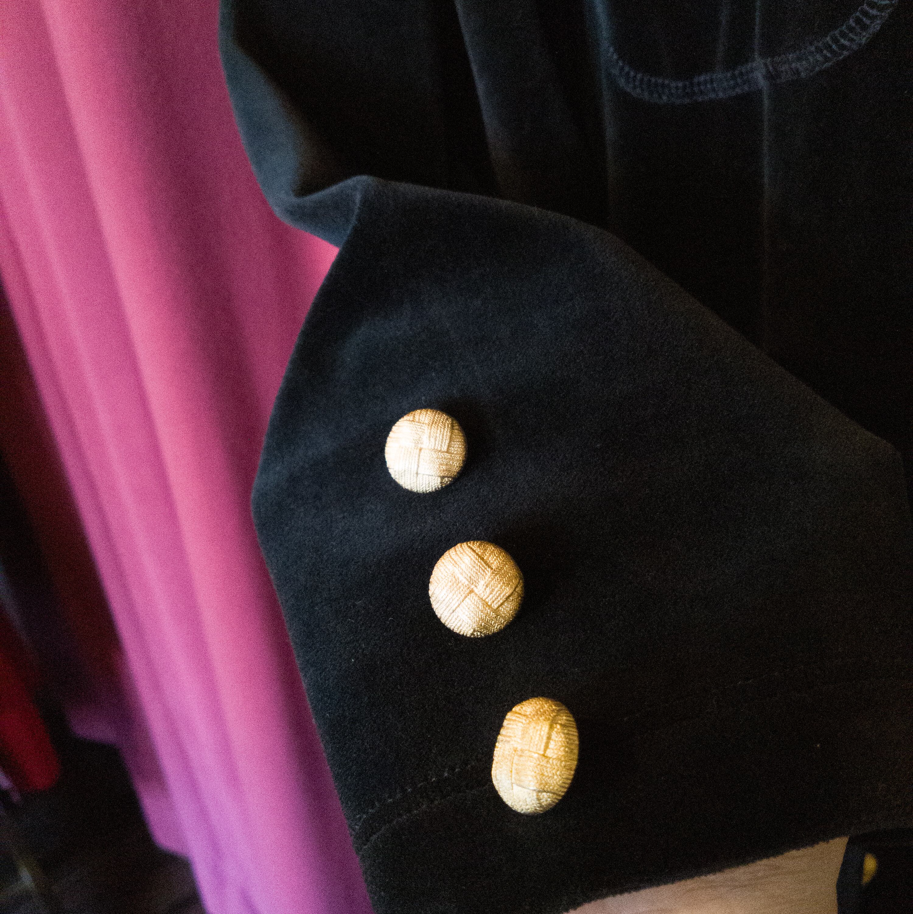 ディテール:マットな質感のゴールドボタン、伸縮性のあるストレッチベロア素材、アウトリンキング、両サイドスリット、両サイドポケット+チェストポケット、裏地無し